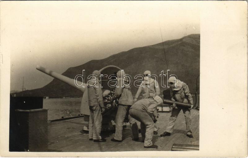 Osztrák-magyar haditengerészeti Zenta-osztályú védett cirkáló matrózai tüzelés előtt védőruhában / K.u.K. Kriegsmarine Matrosen / Austro-Hungarian Navy Zenta-class protected cruiser's mariners wearing protective suits before firing a gun. photo