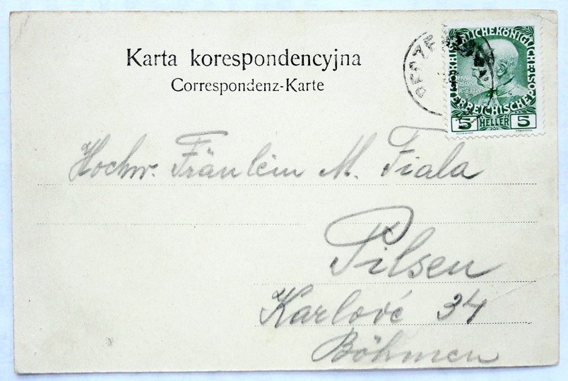 Brak danych wydawniczych. Z korespondencją dat.: "24./VI 13"?, znaczkiem i stemplem pocztowym. Stan dobry.