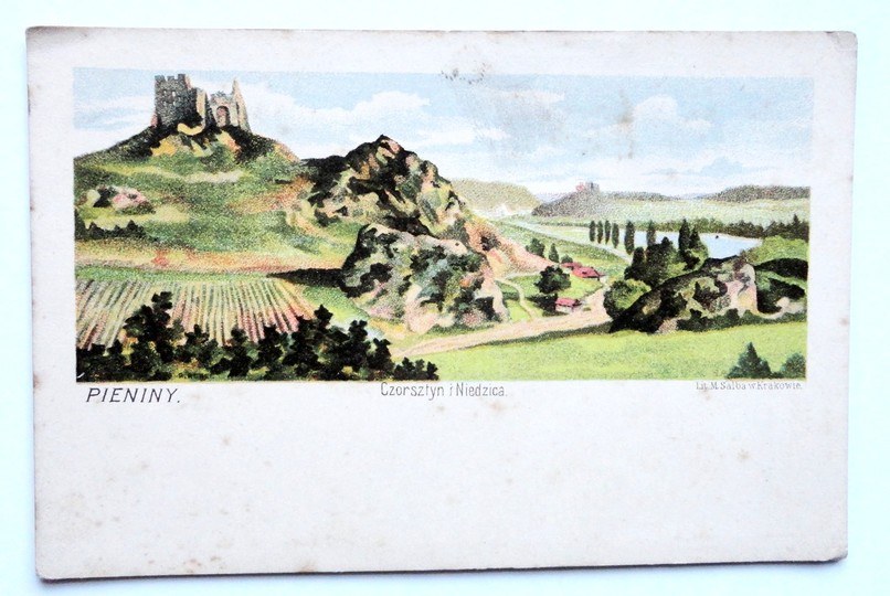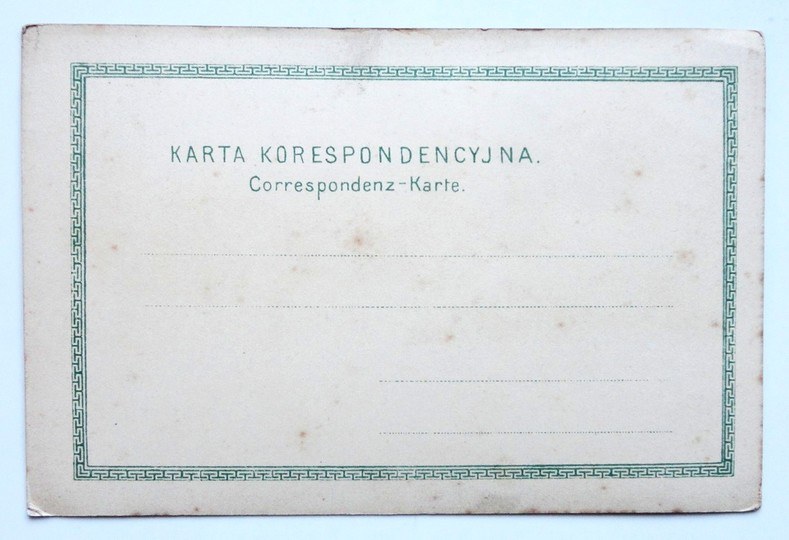 Lit. M. Salba w Krakowie. Bez korespondencji i znaczka. Pocz. XX w. Pocztówka litograficzna z długą linią adresową. Niewielkie miejscowe zaplamienia, poza tym stan dobry.