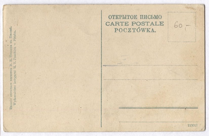 Wydawnictwo Księgarni M. N. Peachina w Pińsku [i to samo cyrylicą]. 113017. Bez korespondencji i znaczka. Otarcie narożnika.