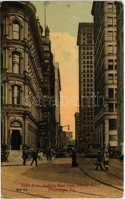 Pittsburgh (Pennsylvania), Sixth Ave. looking East from Liberty Ave., Mechants Bank, US Army Recruiting Station ("Men Wanted"), tram, automobiles (EK)