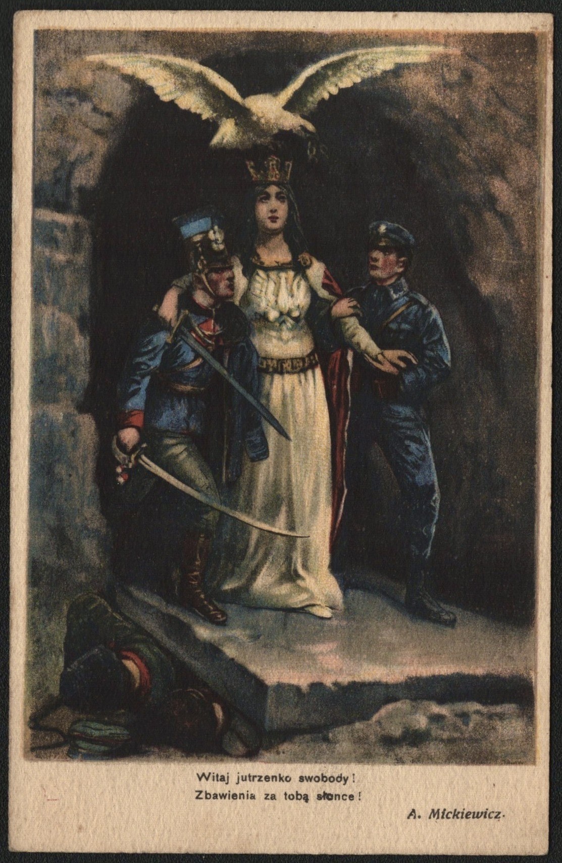 Pocztówka patriotyczna. Zmartwychwstanie Polski. "Witaj jutrzenko swobody! Zbawienia za tobą słońce! A. Mickiewicz"