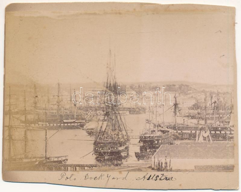Pola, cs. és kir haditengerészeti kikötő 1870-ben: SMS ADRIA, SMS DON JUAN DE AUSTRIA, SMS SCHWARZENBERG / K.u.k. Kriegsmarine Kriegshafen / Austro-Hungarian Navy port. photo glued on board (14 x 10 cm)