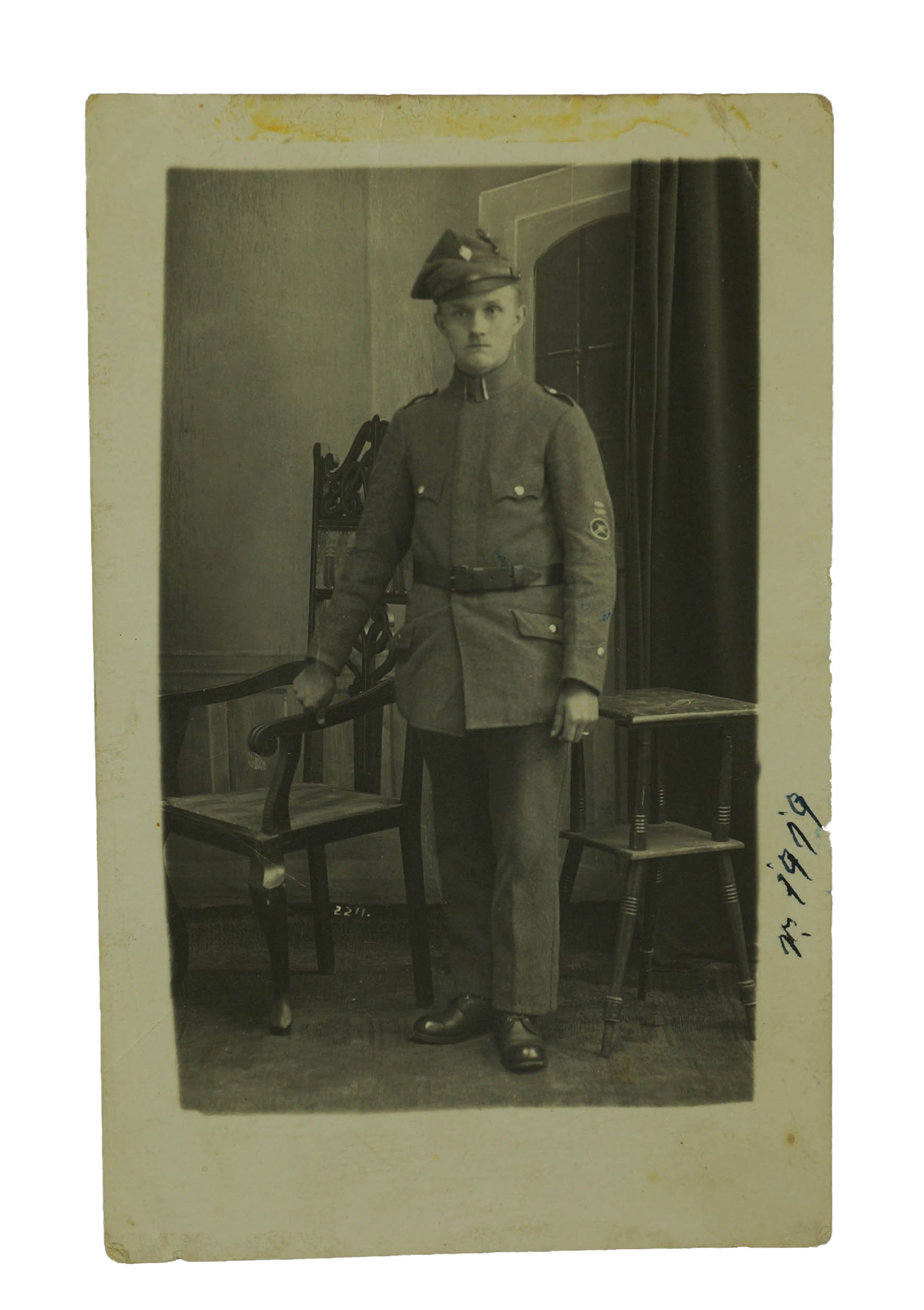 Powstaniec wielkopolski [Józef Mazurczak] w mundurze, na rękawie naszywka, 1919 rok, fotografia pocztówkowa, f. 8,5 x 13cm