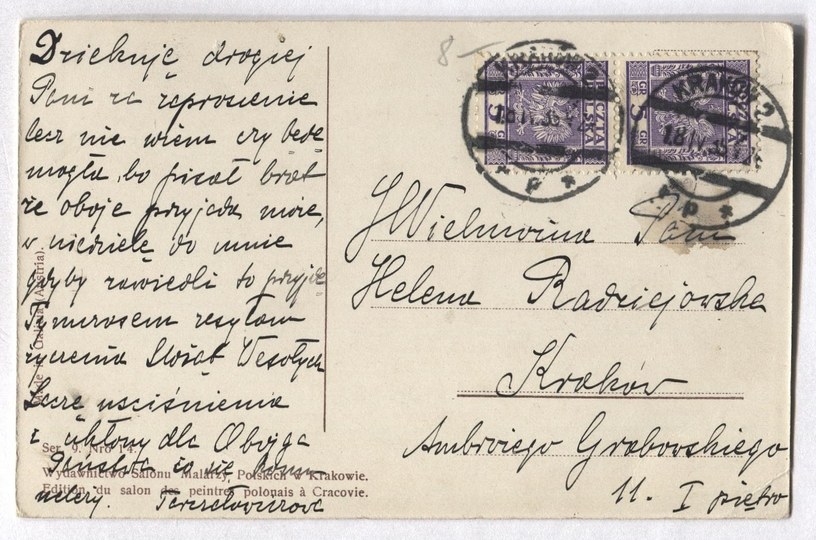Wydawnictwo Salonu Malarzy Polskich w Krakowie. Ser. 9. Nro 14. Made in Galicia (Austria). Lata 10. XX w. Pod kompozycją nadruk "Lit. K. Kranikowski, Kraków". Z korespondencją i dwoma znaczkami. Data stempla: 18 IV 1935? Zaplamienie tuszem narożnika strony widokowej.