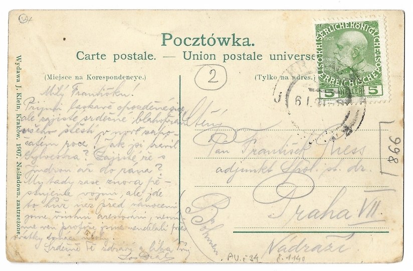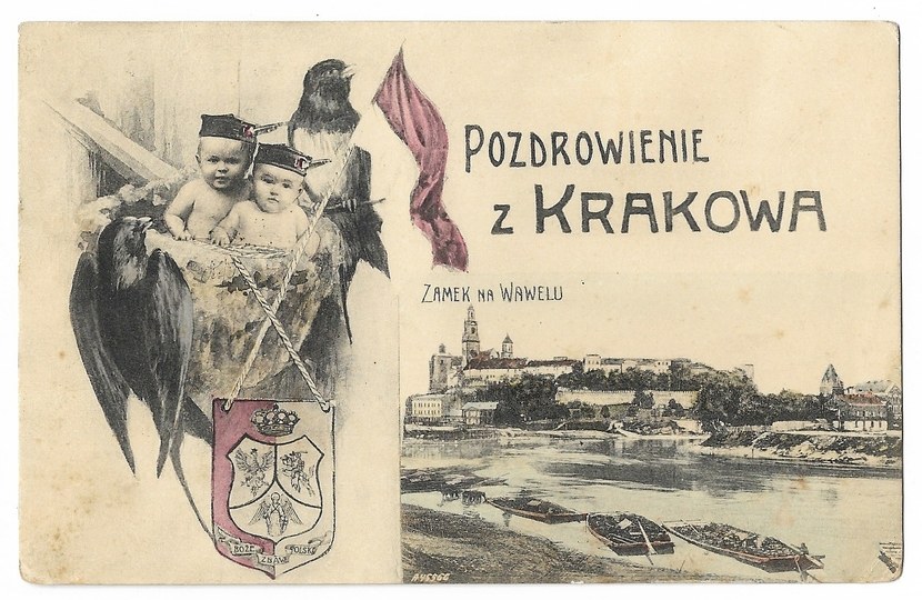 Wydawa [!] J. Klein, Kraków. 1907. Z korespondencją, znaczkiem i stemplem pocztowym. Dwaj "sokoli" w wieku niemowlęcym w gnieździe. Miejscowe zaplamienia, poza tym stan dobry.