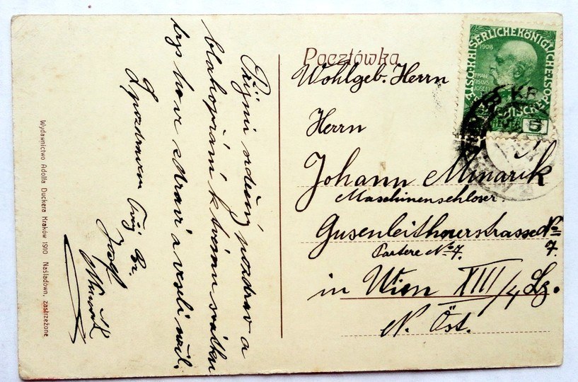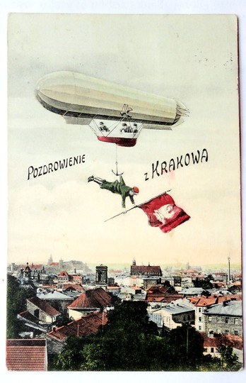 Wydawnictwo Adolfa Duckera Kraków 1910. Z korespondencją, znaczkiem i stemplem pocztowym. Młody mężczyzna przelatujący nad miastem, podwieszony pod balonem obserwacyjny za pomocą kotwicy, w dłoniach dzierży sztandar z Białym Orłem z koroną. Niewielkie otarcia krawędzi, poza tym stan dobry.