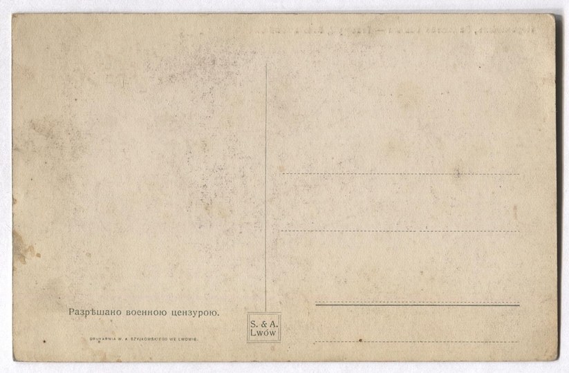 S. & A., Lwów. Drukarnia S. A. Szyjkowskiego we Lwowie. Ca 1915. Na odwrocie nadruk cenzury wojennej (cyrylicą). Drobne zaplamienia.