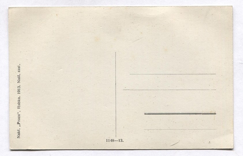Nakł. "Praca", Rabka. 1913. Na odwrocie nadruk "1148-13". Niewielkie załamanie w górnej części, pocztówka lekko pofałdowana.