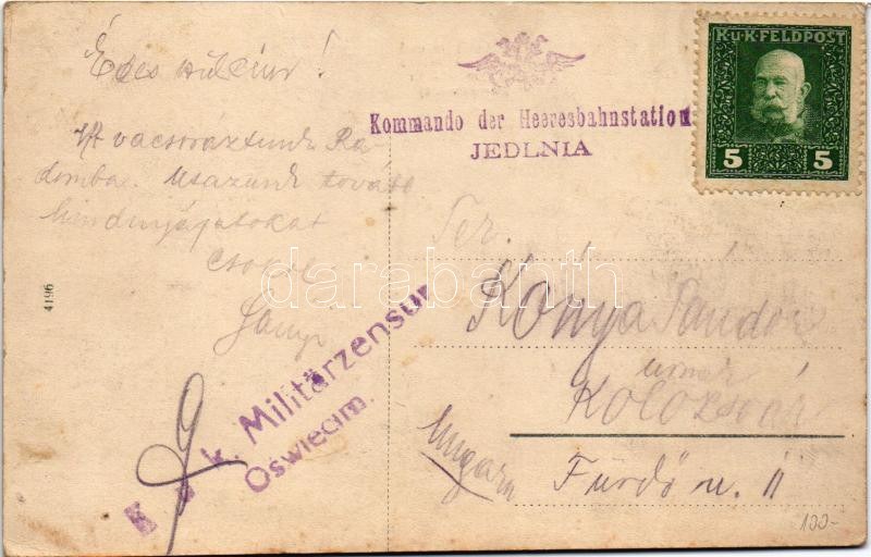 Radom, Ecke Lubliner und Warschauer Strasse / Rog Lubelskiej i Warszawskiej / street, shops + "Kommando der Heeresbahnstation JEDLNIA" "K.u.k. Militärzensur Oswiecim" (fl)