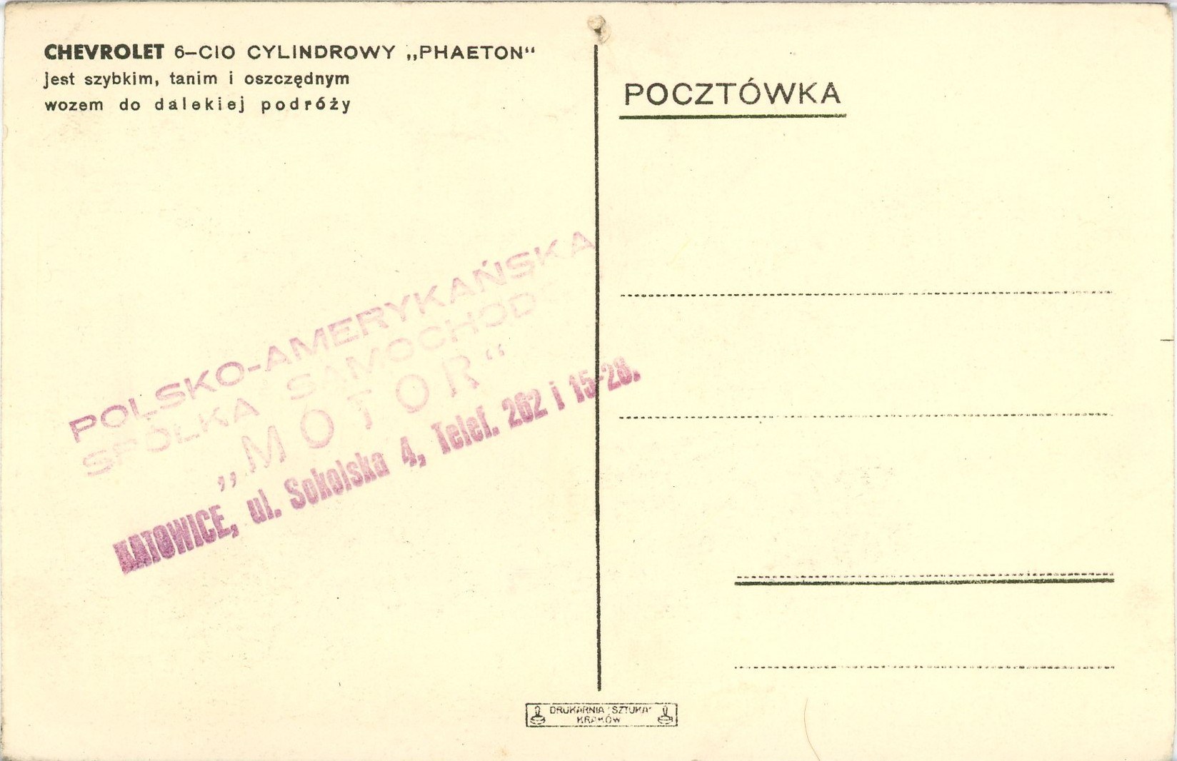 Polsko-Amerykańska Spółka Samochodowa "Motor", Katowice. Przy górnej krawędzi ślad po pinezce, poza tym stan dobry.
