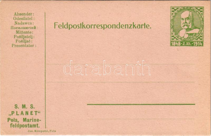 SMS PLANET Feldpostkorrespondenzkarte. Pola, Marinefeldpostamt Jos. Krmpotic + 1848 - 2.XII. - 1914 Ga.