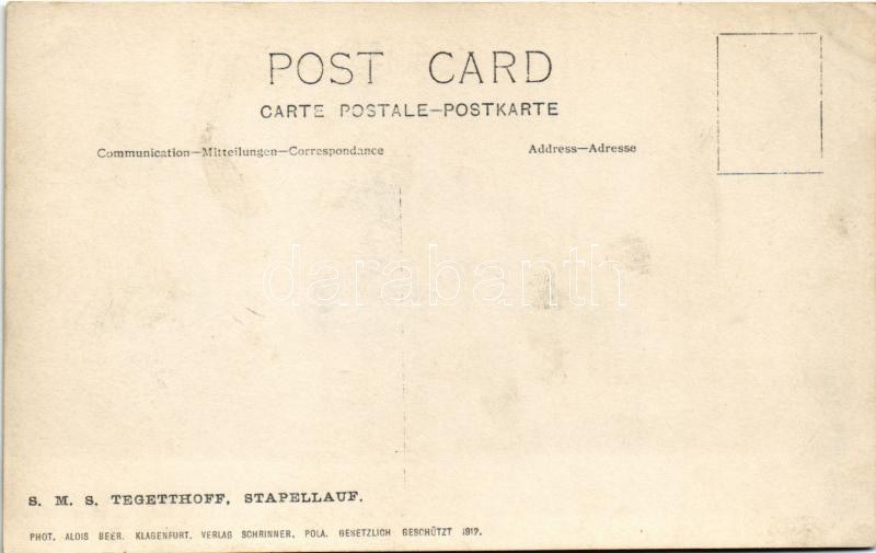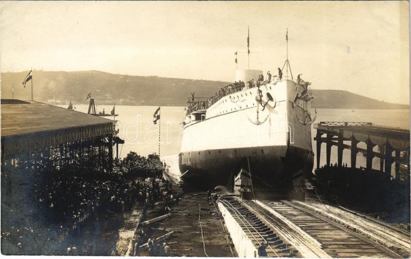SMS Tegetthoff osztrák-magyar haditengerészet Tegetthoff-osztályú csatahajójának vízre bocsájtása felépítmények és oldalvértezet nélkül / K.u.K. Kriegsmarine Stapellauf / Austro-Hungarian Navy, launching of SMS Tegetthoff without superstructure and side armor. Phot. Alois Beer, Schrinner Pola 1912.
