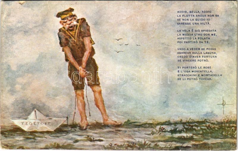 SMS TEGETTHOFF papírcsónak és Ferenc József matrózként. Első világháborús olasz gúnyos propaganda / K.u.K. Kriegsmarine / WWI Italian mocking propaganda with Franz Joseph. N. 2. Serie Cecco Berre F-lli Trasi (EK)