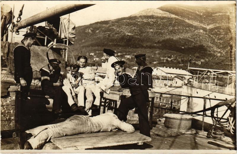 SMS Zara Osztrák-Magyar Monarchia Zara-osztályú torpedóhajó (őrhajója) matrózai pihennek a fedélzeten / K.u.K. Kriegsmarine Matrosen / Austro-Hungarian Navy Zara-class torpedo cruiser, mariners resting on deck. photo (fl)