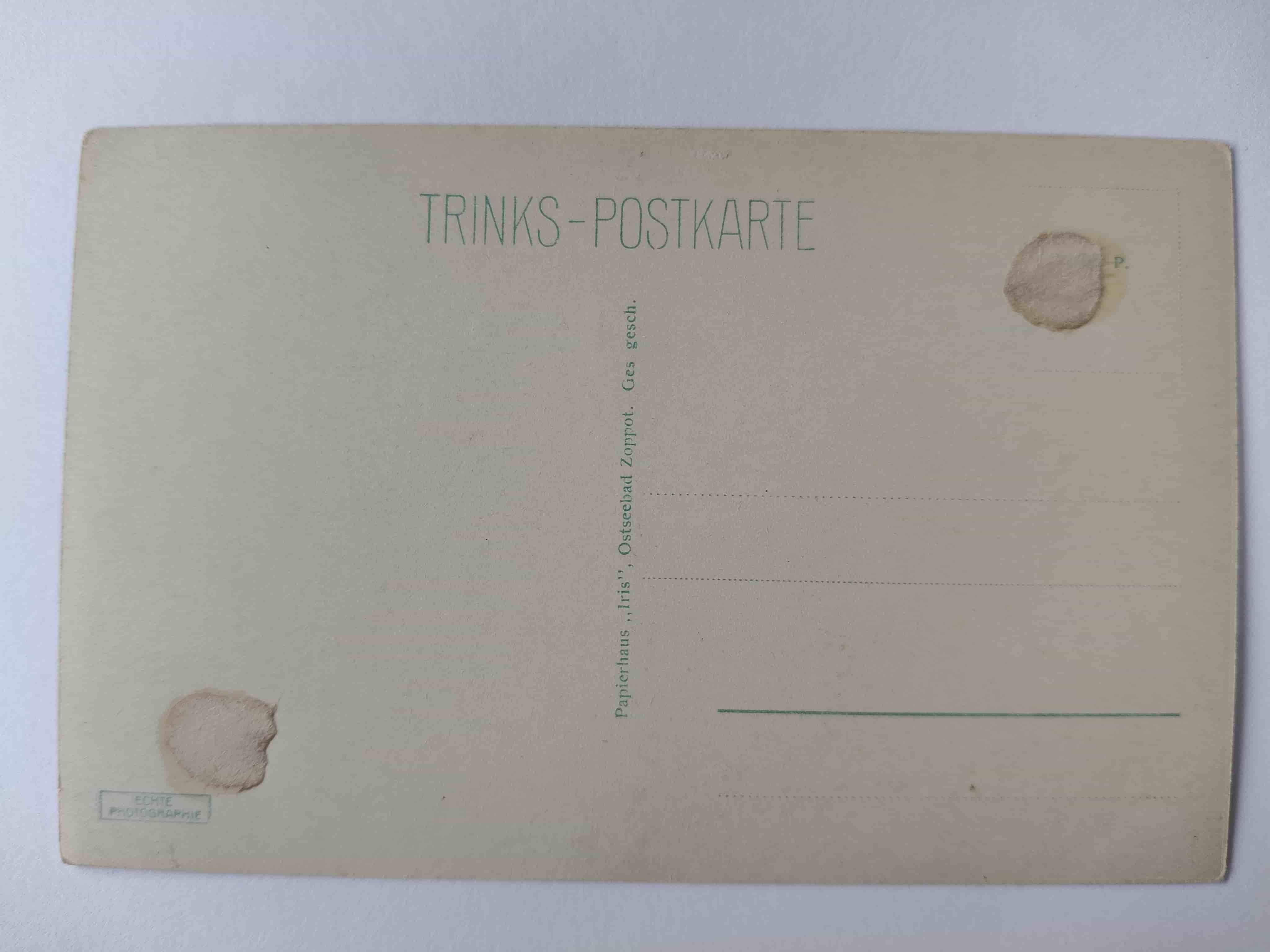 Przedmiotem licytacji jest oryginalna pocztówka. Stan zachowania oraz obieg widoczny na fotografiach, dwie plamy kleju na rewersie, brak wad ukrytych.