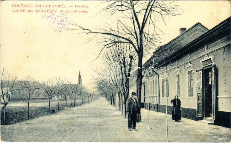 Szeghegy, Sekic, Lovcenac; Fő utca, L. D. Schaffe üzlete, templom. W.L. Bp. 620. Becker Dávid & Co. kiadása / main street, shop, church