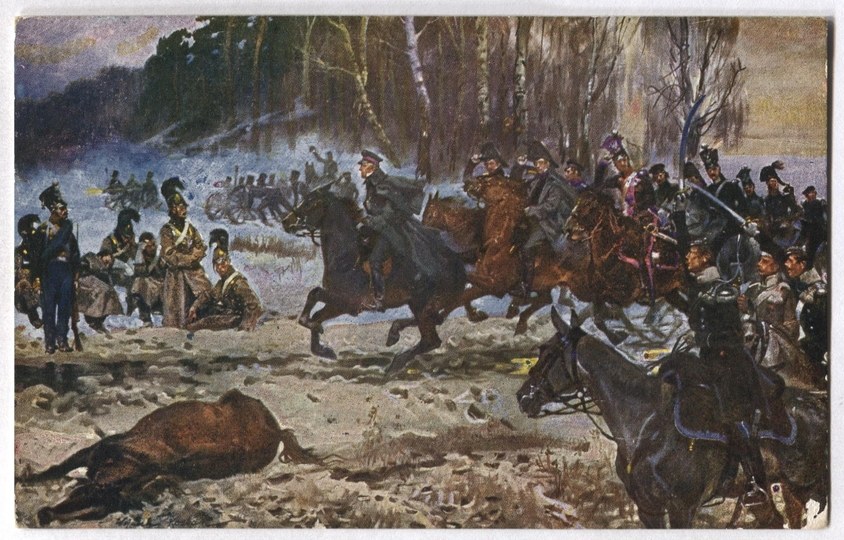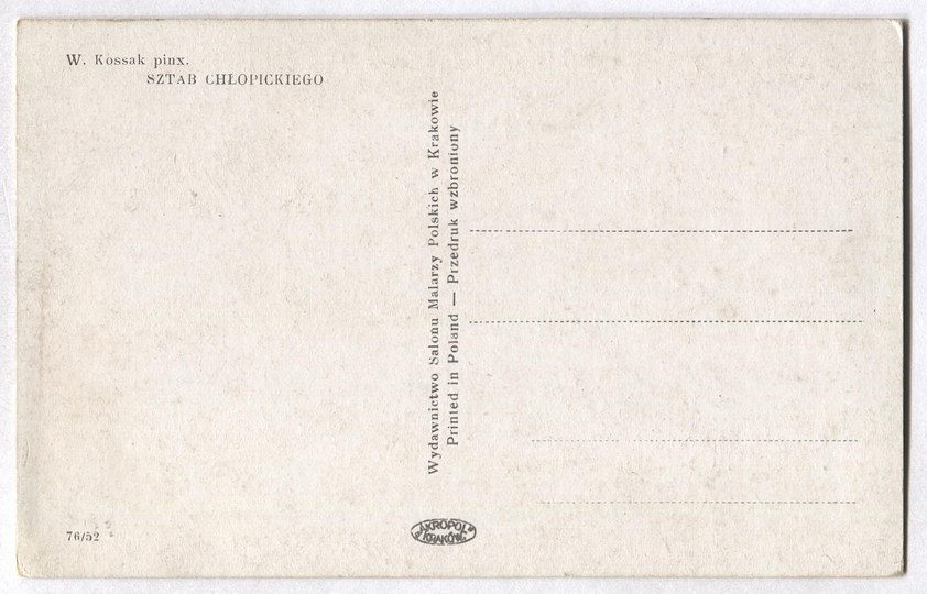 Wydawnictwo Salonu Malarzy Polskich w Krakowie. Druk. "Akropol" w Krakowie. Na odwrocie nadruk "76/52". Reprodukcja obrazu Wojciecha Kossaka. Bez korespondencji i znaczka. Dolny narożnik uszkodzony.
