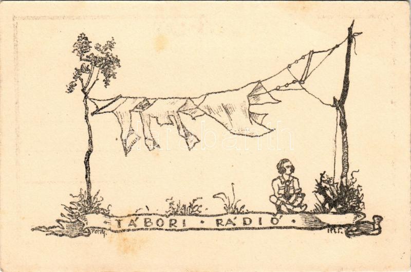 Tábori rádió. Magyar cserkész művészlap / Hungarian boy scout art postcard s: Petry (fl)