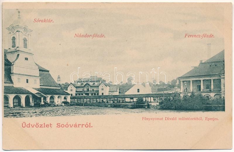 Tótsóvár, Sóvár, Soóvár, Solivar; Sóraktár, Nándor főzde, Ferenc főzde. Fénynyomat Divald műintézetéből / salt depot...
