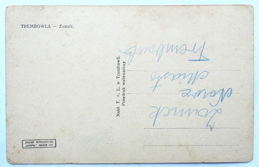 Nakł. T. S. L. w Trembowli. Zakłady Reprodukcyjne "Akropol", Kraków XXII. Lata 30. XX w.? Bez korespondencji i znaczka. Na odwrocie odręcznie: "Zamek Nowe Miasto Trembowla". Miejscowe zaplamienia, stan dobry.