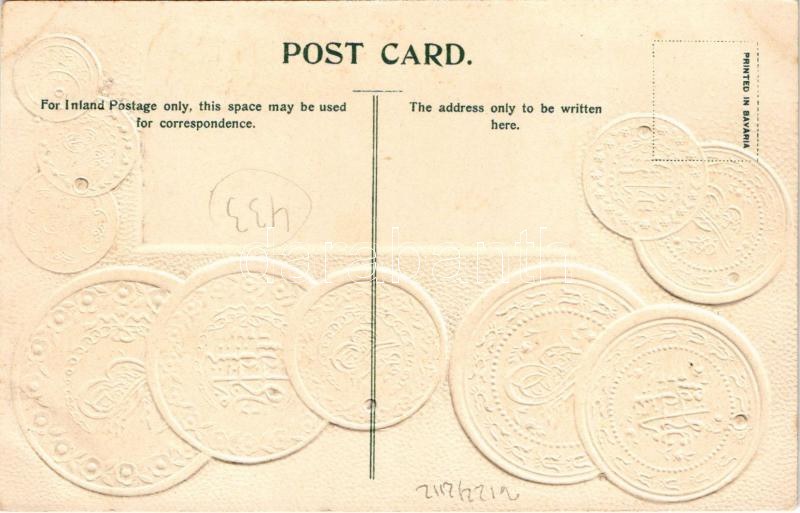 Türkiye / Turkey - Set of Turkish coins, national flag, currency exchange chart. H. S. M. Emb. litho (tiny pinhole...