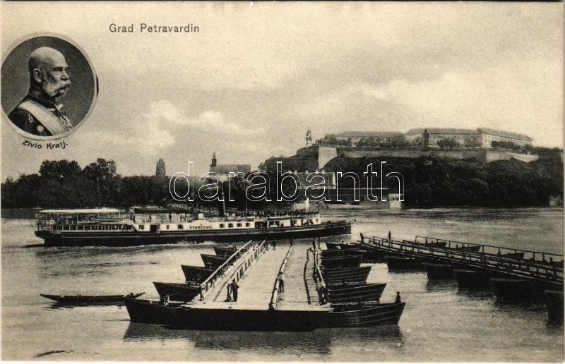Újvidék, Novi Sad; Pétervárad vár, nyitott pontonhíd elhaladó "STARCEVIC" gőzhajóval. Verlag J. Singer Hoffotograf ...
