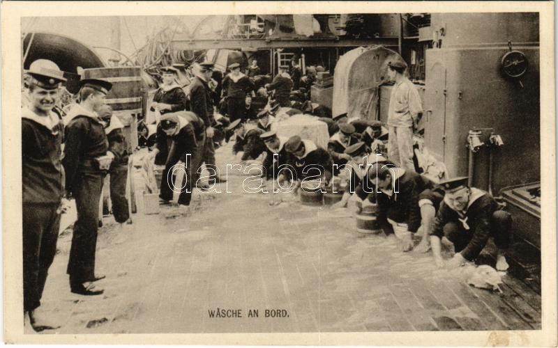 Wäsche an Bord. K.u.K. Kriegsmarine / Osztrák-magyar haditengerészet matrózai fedélzet felmosása közben / Austro...