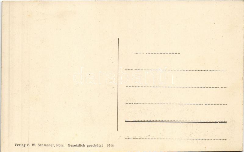 Wäsche an Bord. K.u.K. Kriegsmarine / Osztrák-magyar haditengerészet matrózai fedélzet felmosása közben / Austro-Hungarian Navy mariners cleaning the board of a battleship. Verlag F.W. Schrinner, Pola 1914