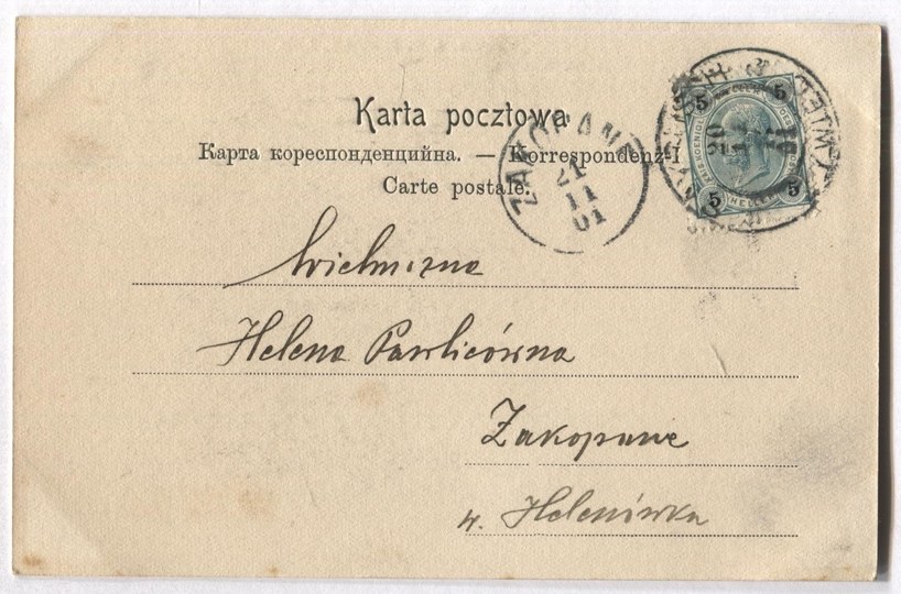 Nakład: S. W. Niemojowski, Lwów. Światłodruk "Eureka", Lwów. Kompozycja Kajetana Saryusza-Wolskiego. Z korespondencją i znaczkiem. Data stempla: 21 XI 1901. Drobne zaplamienia.