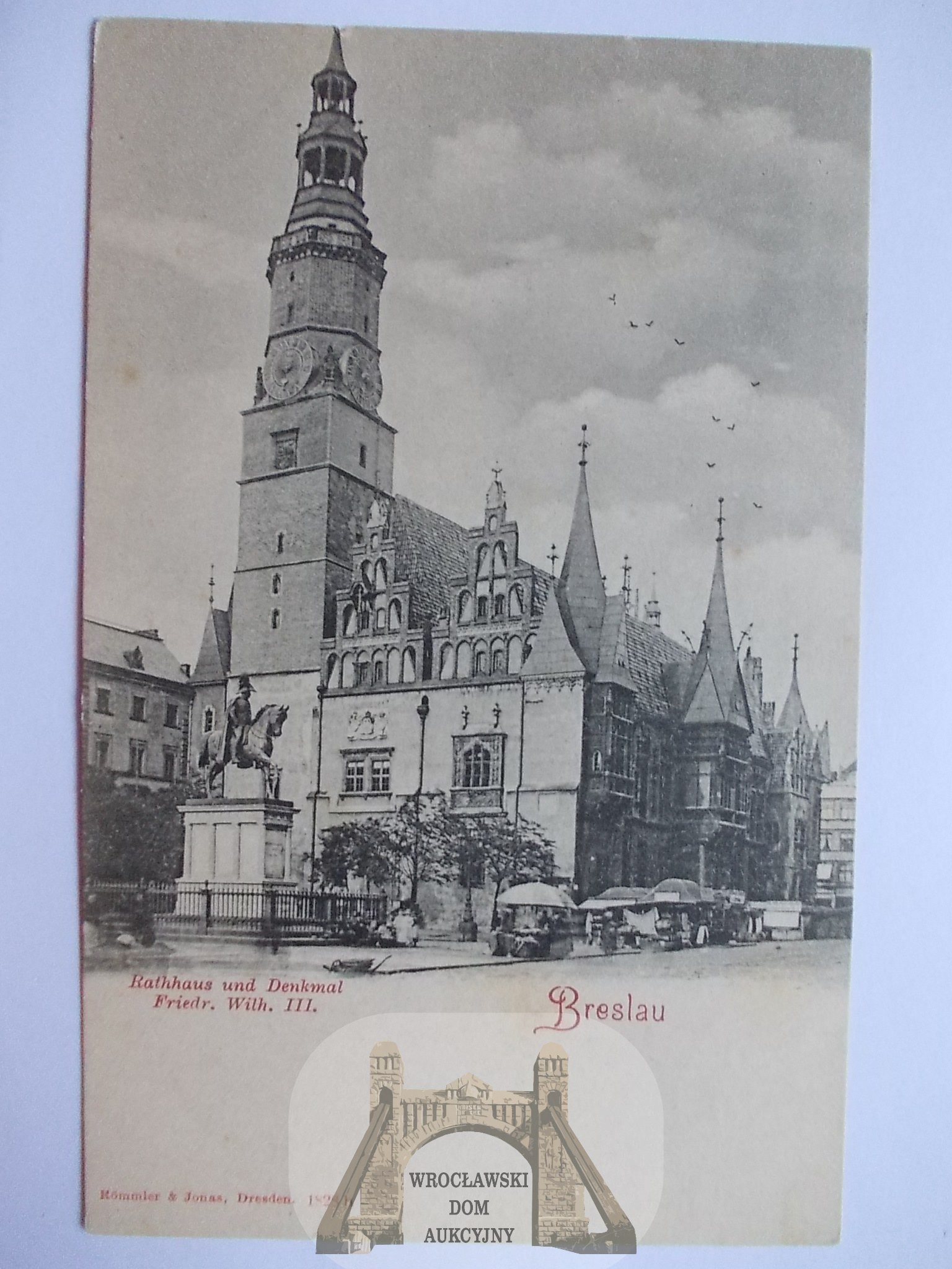 Wrocław, Breslau, ratusz i pomnik Fryderyka Wilhelma III, ok. 1904