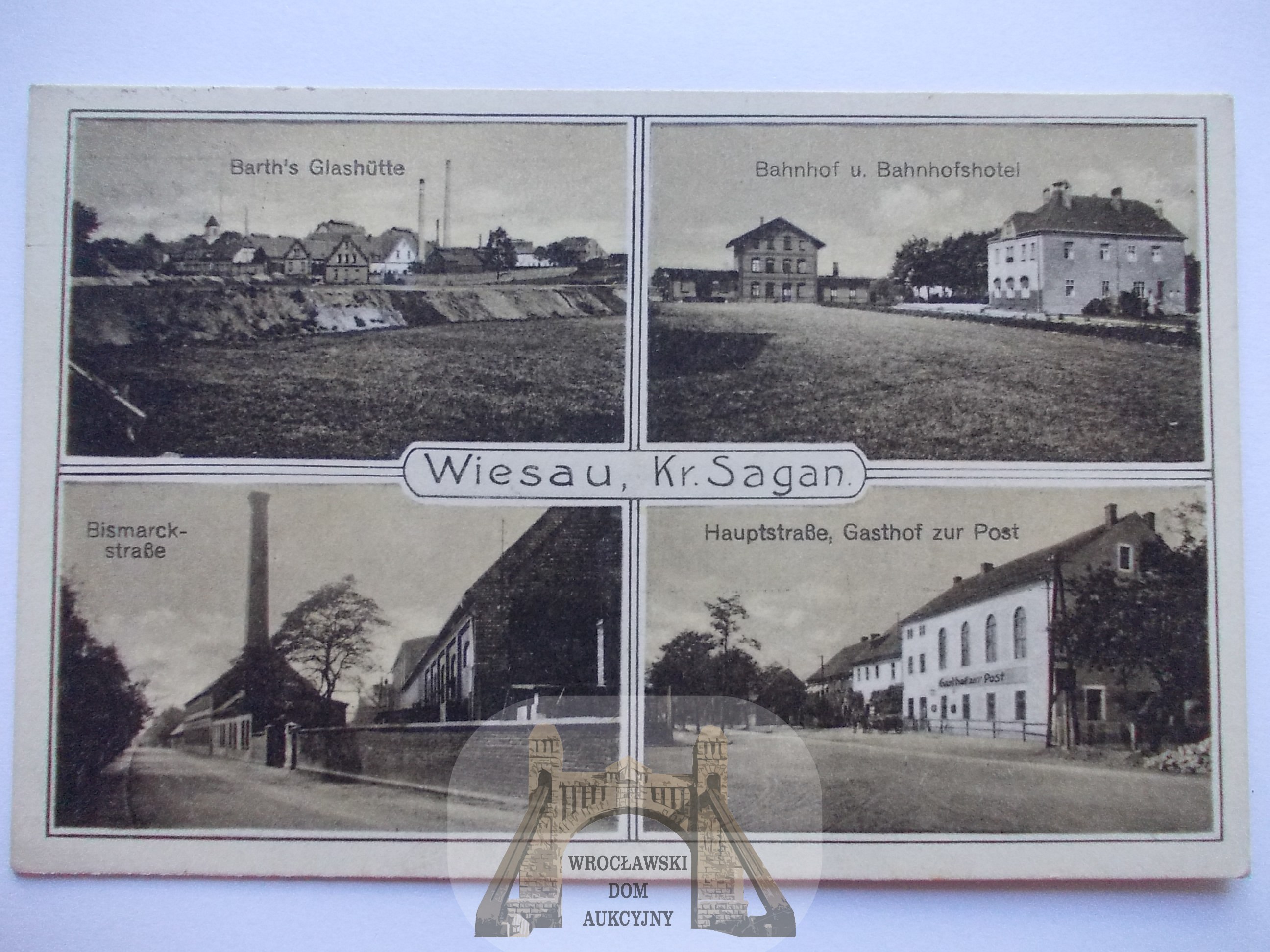 Wymiarki k. Żagań, huta szkła, dworzec, ulica, 1930