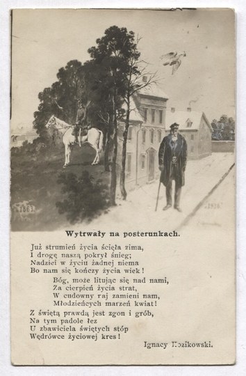 WYTRWAŁY na posterunkach. Już strumień życia ścięła zima, / I drogę naszą pokrył śnieg; / Nadziei w życiu żadnej niema / Bo nam się kończy życia wiek! [...].