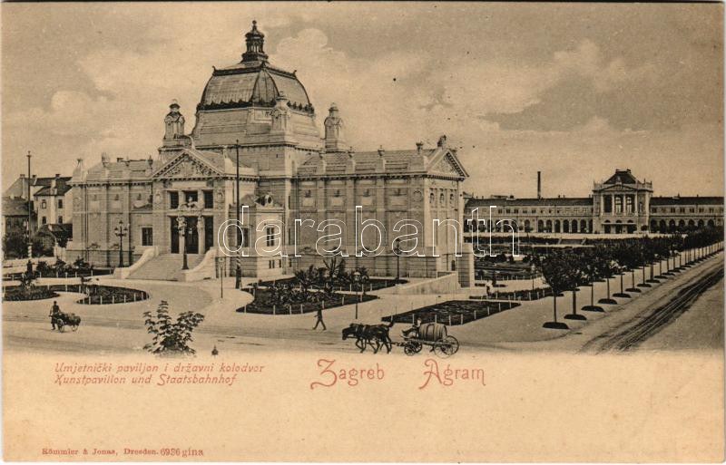 Zagreb, Zágráb; Umjetnicki paviljon i drzavni kolodvor / Kunstpavillon und Staatsbahnhof / vasútállomás és Művészetek palotája / railway station and Palace of Art