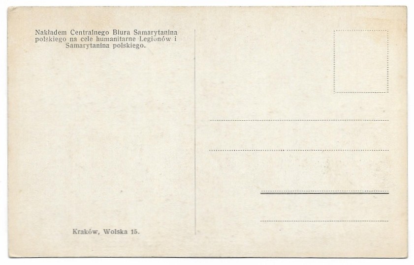 Nakładem Centralnego Biura Samarytanina polskiego na cele humanitarne Legionów i Samarytanina Polskiego. Kraków, Wolska 15. Reprodukcja pracy Józefa Saryusza Ryszkiewicza z 1915. Bez korespondencji i znaczka. Stan dobry.