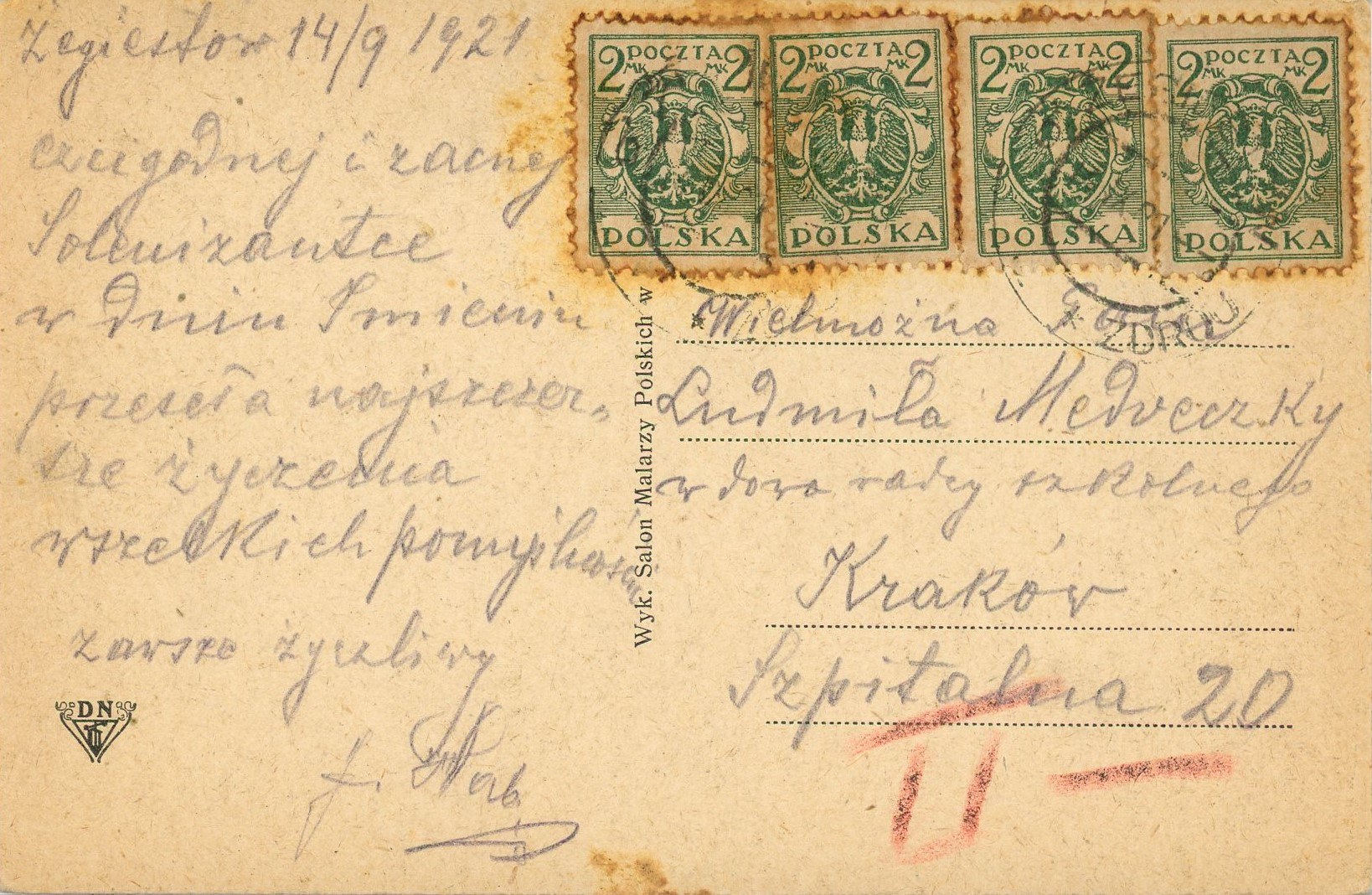 Wyk. Salon malarzy Polskich w Krakowie. Kartka zapisana, dat. 14.9.1921 r. Stan bardzo dobry.
