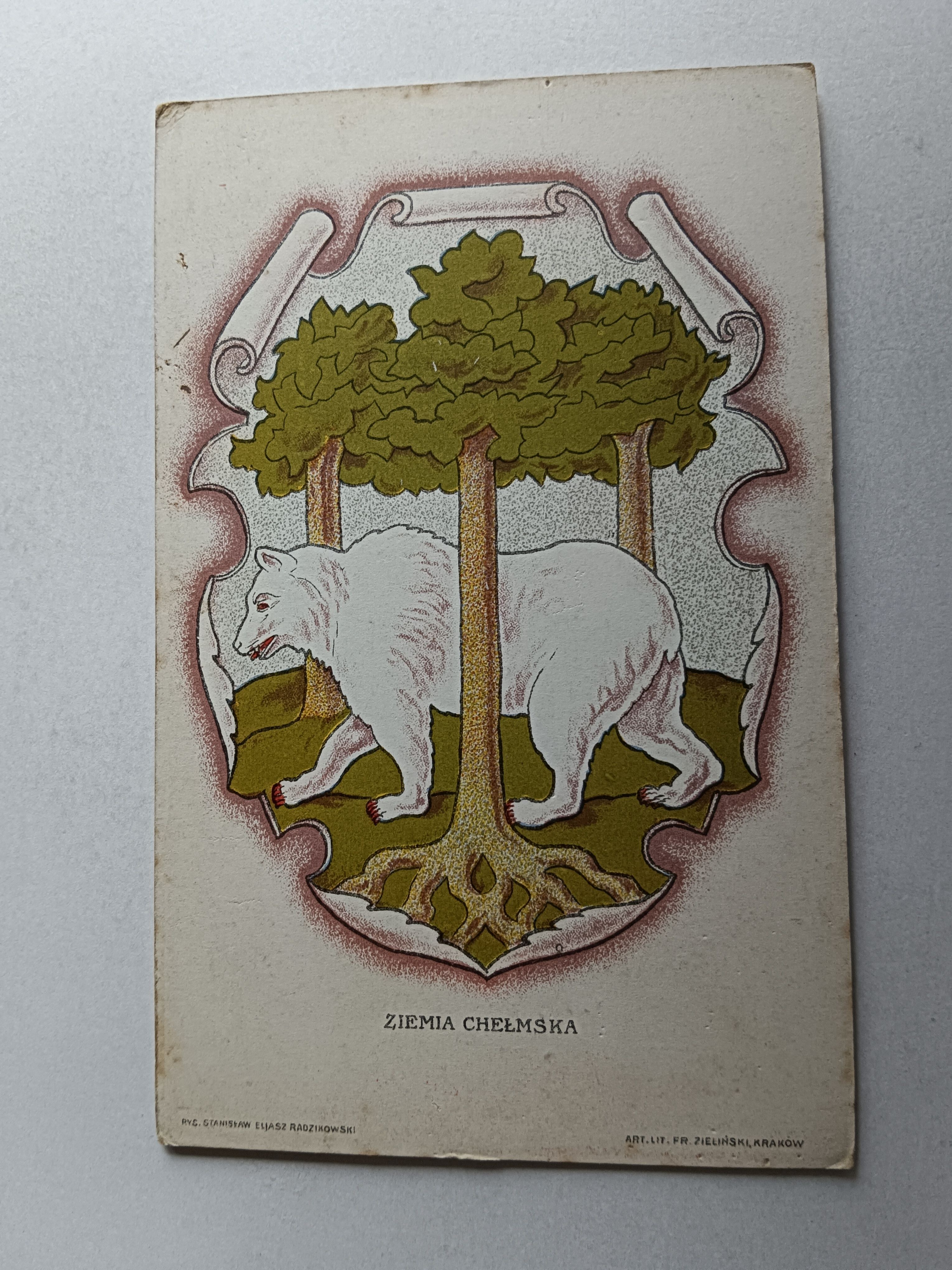 ZIEMIA CHEŁMSKA, HERB, NIEDŹWIEDŹ, PRZEDWOJENNA, RYS ELJASZ RADZIKOWSKI, LEKKO ROZKLEJA SIĘ