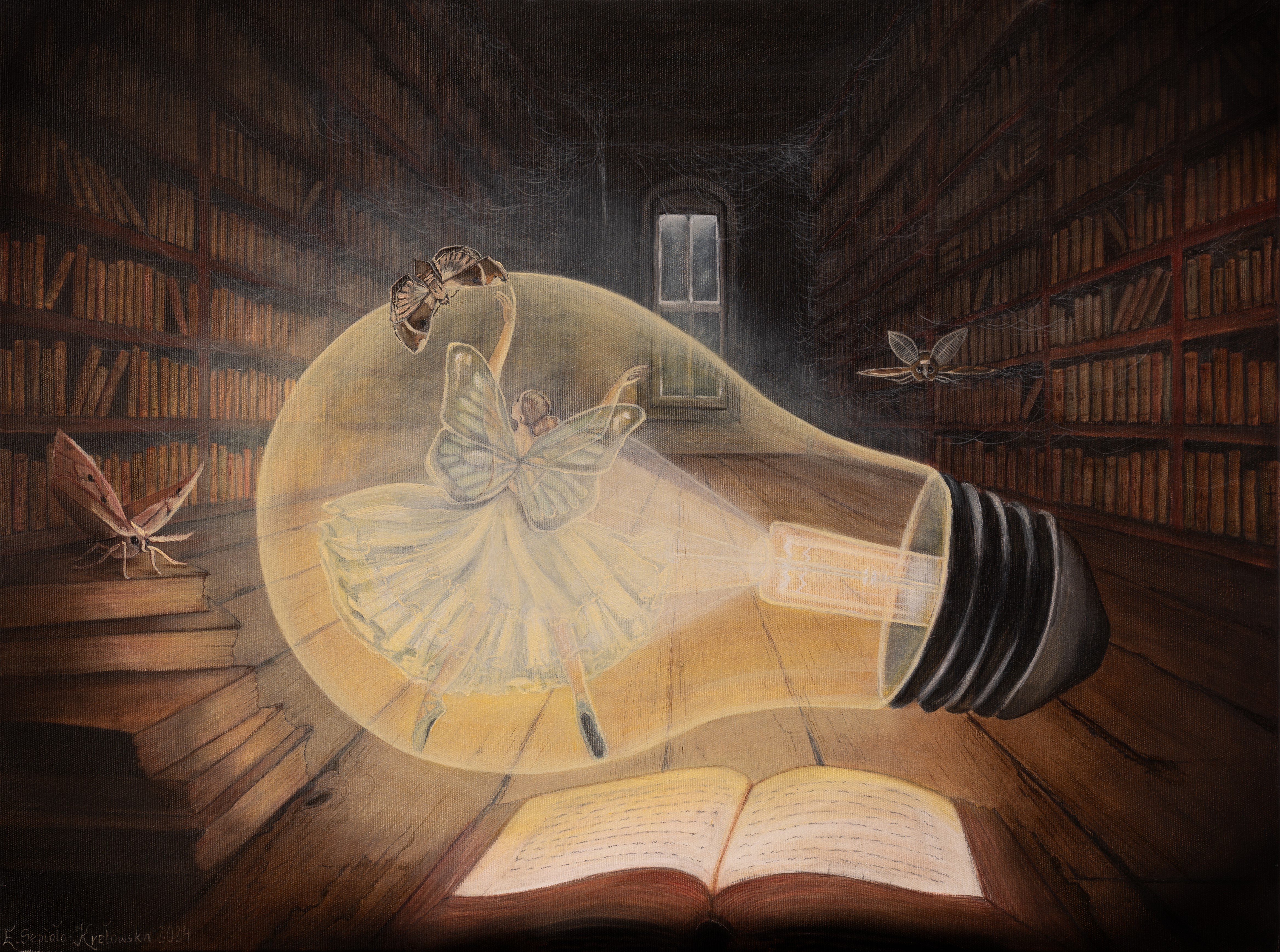 Ewa Sepioło - Krełowska: "...z utęsknieniem czekam na weekendy. Wtedy od rana do wieczora mogę spokojnie robić to, co kocham. Maluję pod wpływem emocji i różnych wydarzeń. Często obrazy są odzwierciedleniem snów. Niektóre powstają na bieżąco, inne znów są głęboko przemyślane, powstają w głowie miesiącami. Często zmieniam też pierwotną koncepcję, co uważam za bardzo intrygujące. Nie mogę być pewna, że to co namaluję jednego dnia zostanie, czy zmieni się w coś zupełnie innego...