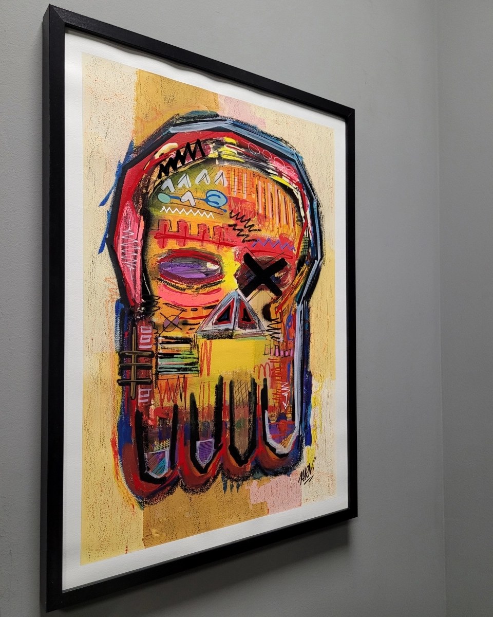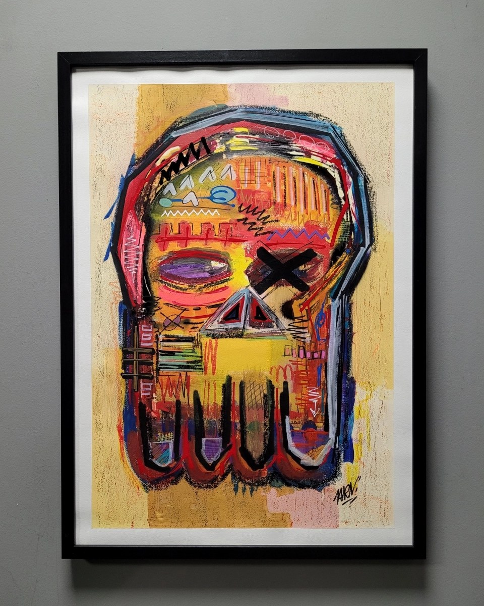 technika mieszana (farba i tusz akrylowy, spray, markery), papier, 70 x 50 cm (arkusz), w oprawie: 72, 5 x 52, 5 cm, sygn. p.d.: monogramem