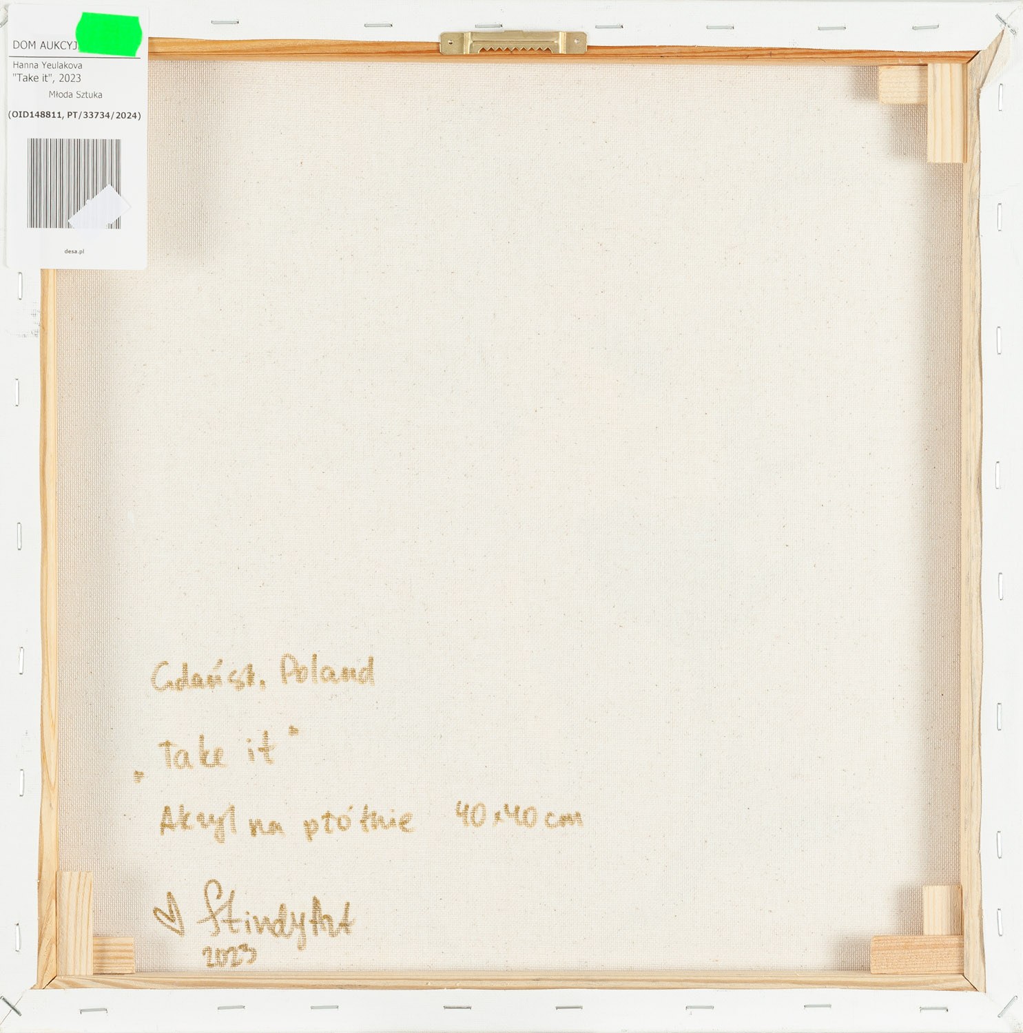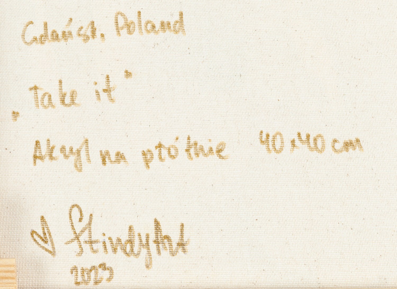 sygnowany, datowany i opisany na odwrociu: 'Gdańsk, Poland | "Take it" | Akryl na płótnie 40x40 cm | StindyArt | 2023'