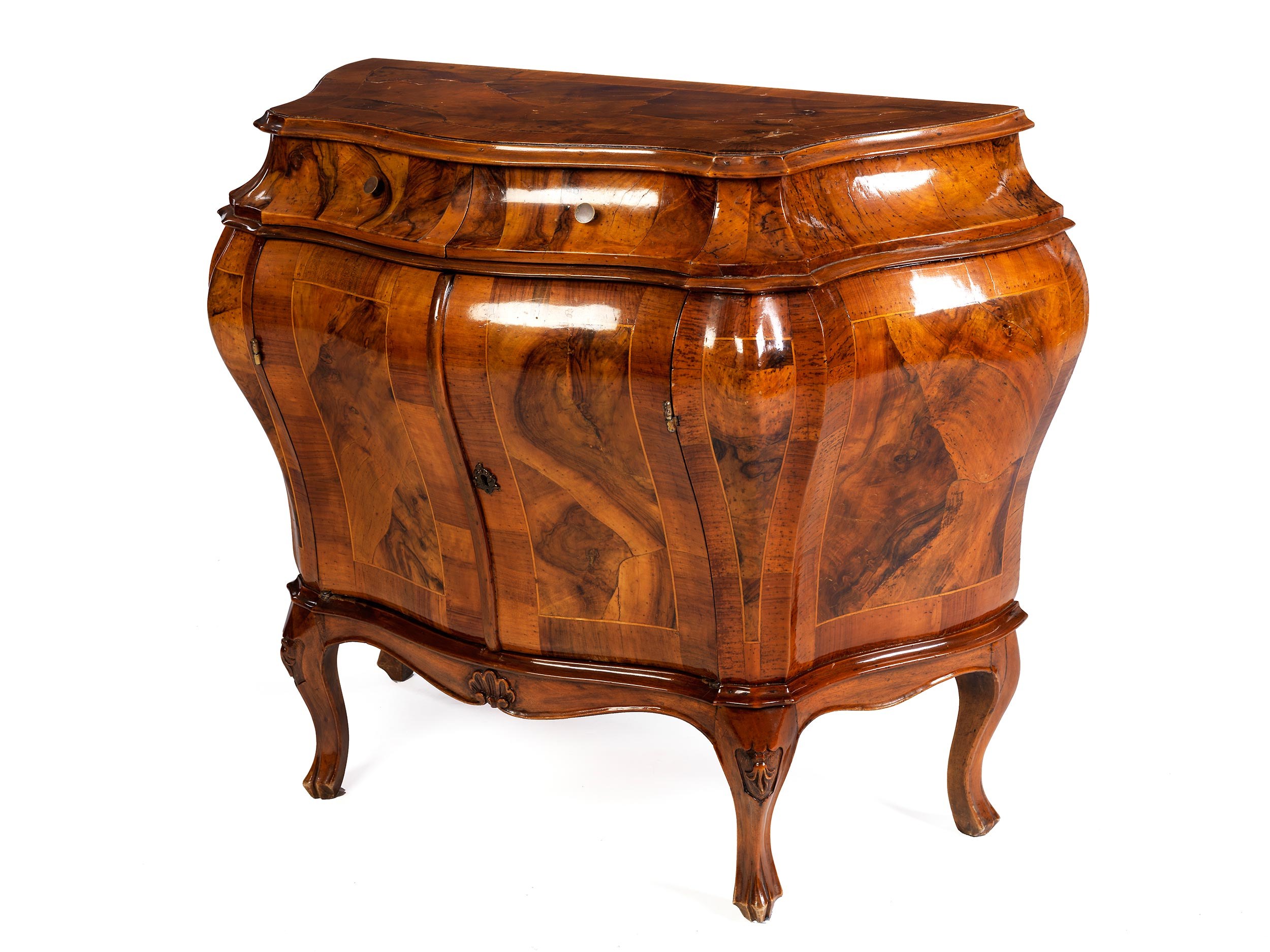 Auf kurzen gebogenen Beinen der geschweifte Korpus aus Wurzelholz. Oben zwei nebeneinanderliegende Schübe, darunter die zur Seite aufschließbaren Türen, Platte und Korpus teils mit Fadenintarsien. Ein Schlüssel vorhanden. (1411331) (18)