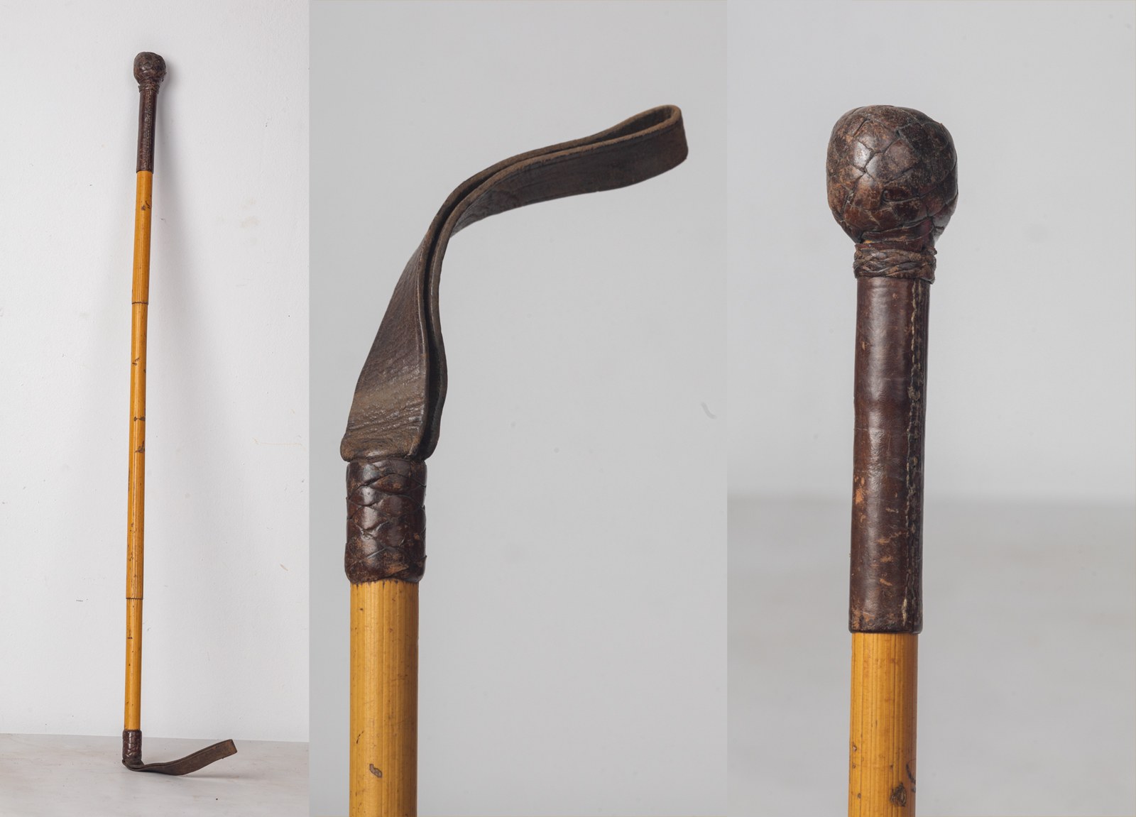 Szpicruta wykonana z pędu bambusowego, z główką metalową obciągniętą splotem rzemieni skórzanych. Stan zachowania dobry.