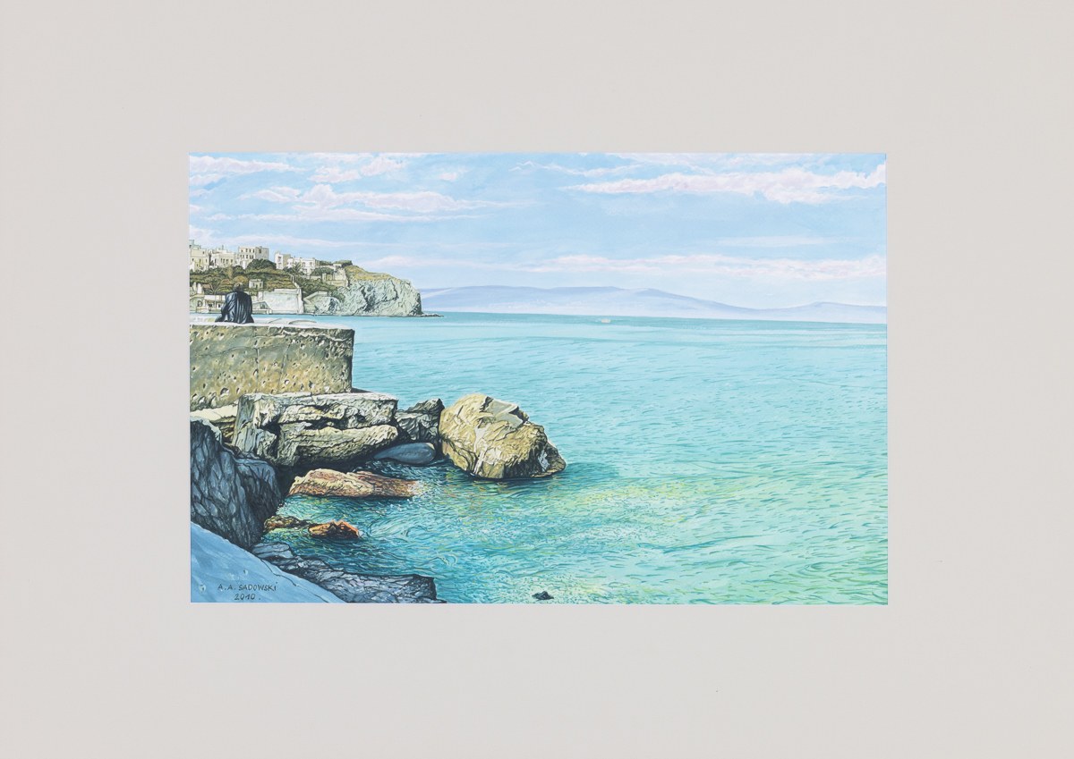 gwasz, papier, 37,5x52 cm arkusz, 50x70 cm z passe-partout, sygn. l.d.: A. A. SADOWSKI 2010, opisany na odwrocie: 761. ANDRZEJ A. SADOWSKI, ŁÓDŹ | "SIROS – ERMOUPOLI – SAMOTNIK W SKÓRZANEJ KURTCE" | GWASZ/PAPIER, WYM: 29,7x45,6 cm, 2010
