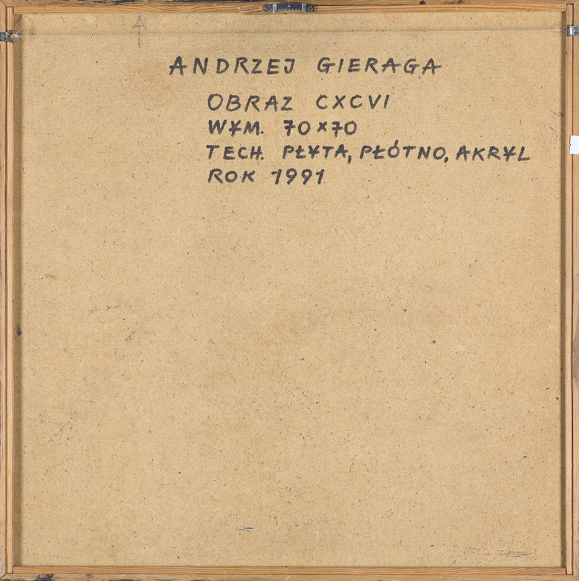 sygn. na odwr. na płycie g.: ANDRZEJ GIERAGA | OBRAZ CXCVI | WYM. 70 x 70 | TECH. PŁYTA, PŁÓTNO, AKRYL | ROK 1991