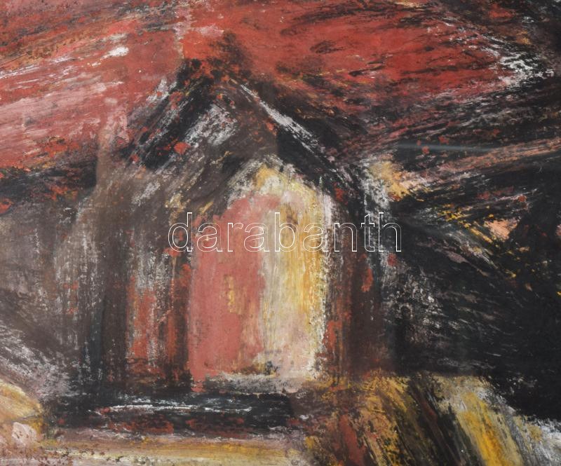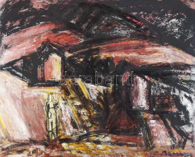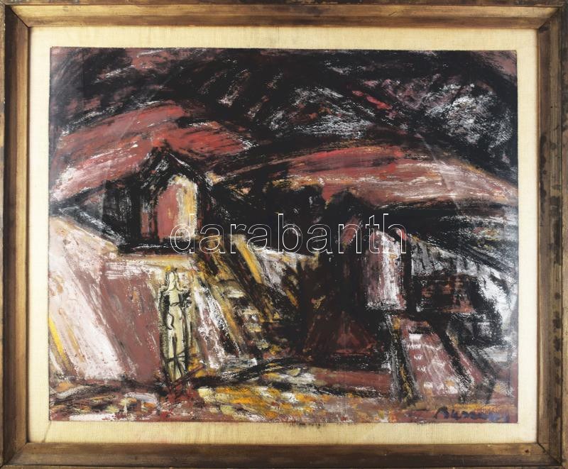 Barcsay Jenő (1900-1988): Dombos táj alakkal. Vegyes technika, karton. Jelezve jobbra lent: Barcsay. Aukcionálva: Kieselbach Galéria, 65. Nyári Aukció, 2021.06.14, 191. tétel. Proveniencia: Vásárlás BÁV-tól, 1980-as évek (hátoldalán régi BÁV címkével). Üvegezett fakeretben, 56×71 cm