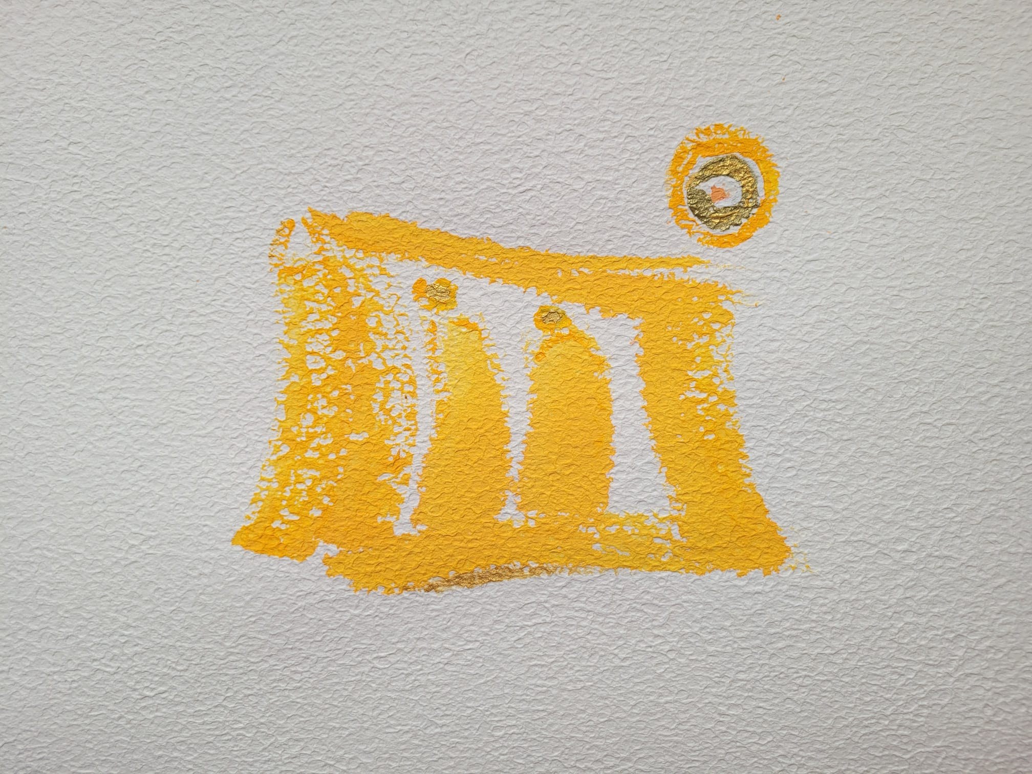 Ewa Kujawska, Together nr 1, akryl na papierze, 47x47 cm w świetle oprawy, 2023 to praca artystki z serii żółtej malarstwa akrylowego na papierze. Ta oraz pozostałe obrazy z tej serii są połączeniem minimalizmu formy z ekspresją wyrazu. Syntetyczne ujęcie kompozycji, często w formie znaku mającego walor symbolu. Seria niezwykle „przyjazna oku” z doskonałą aurą. W abstrakcyjnych formach uwikłane ludzkie postaci, nieoczywiste, ale czytelne. Technika malarska na papierze dodaje lekkości przedstawieniu, zaś kolor żółty, łączony podobnie jak złoty z majestatem oraz ze światłem, przekazuje odbiorcy, widzowi pozytywną energię. Seria zarówno kolekcjonerska, jak też przyjazna w najbliższym otoczeniu widza, w przestrzeniach mieszkania, domu – regeneruje nastrój, wprowadza optymizm. Praca oprawiona w drewnianej ramie pod szybą. Sygnatura: prawy dół.