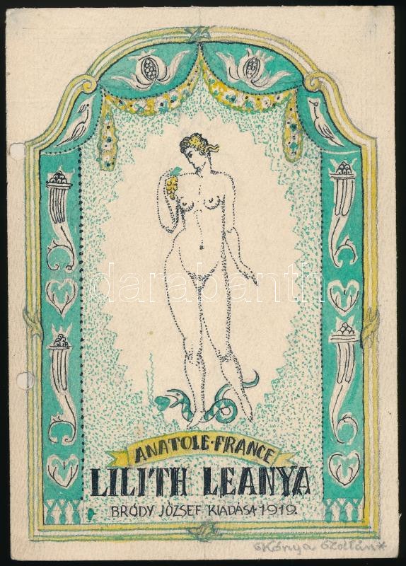 Kónya Zoltán (?-?): Könyvborító terve, Anatole France Lilith Leánya c. művéhez (1919). Vegyes technika, papír, jelzett, 17×12 cm