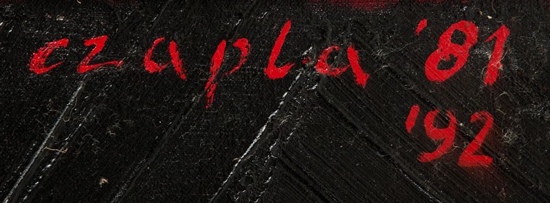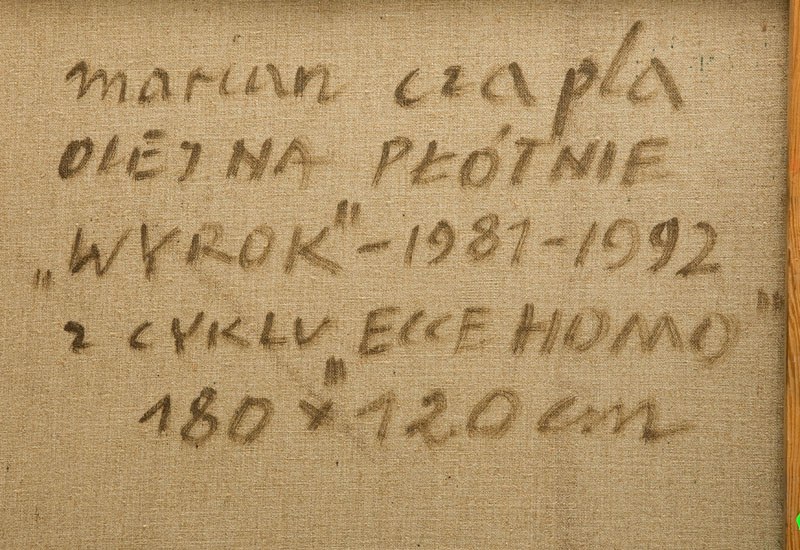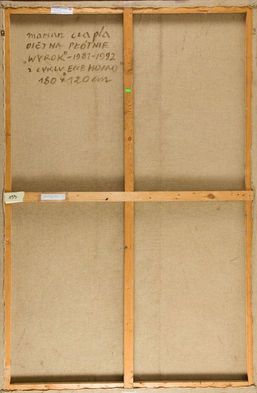sygnowany, datowany i opisany na odwrociu: 'marian czapla | OLEJ NA PŁÓTNIE | "WYROK" - 1981-1992 | Z CYKLU "ECCE HOMO" | 180 x 120 cm' oraz papierowa nalepka wywozowa, nalepka z numerem: '133', nalepka z wystawy Mariana Czapli w Muzeum Narodowym w Kielcach z 2002 roku z numerem 137