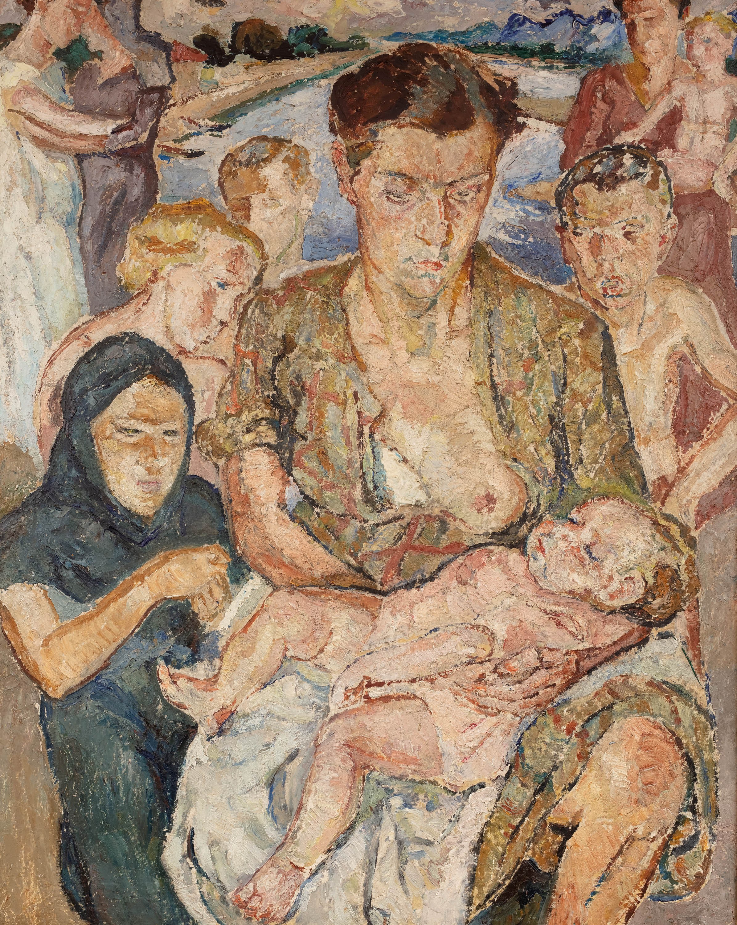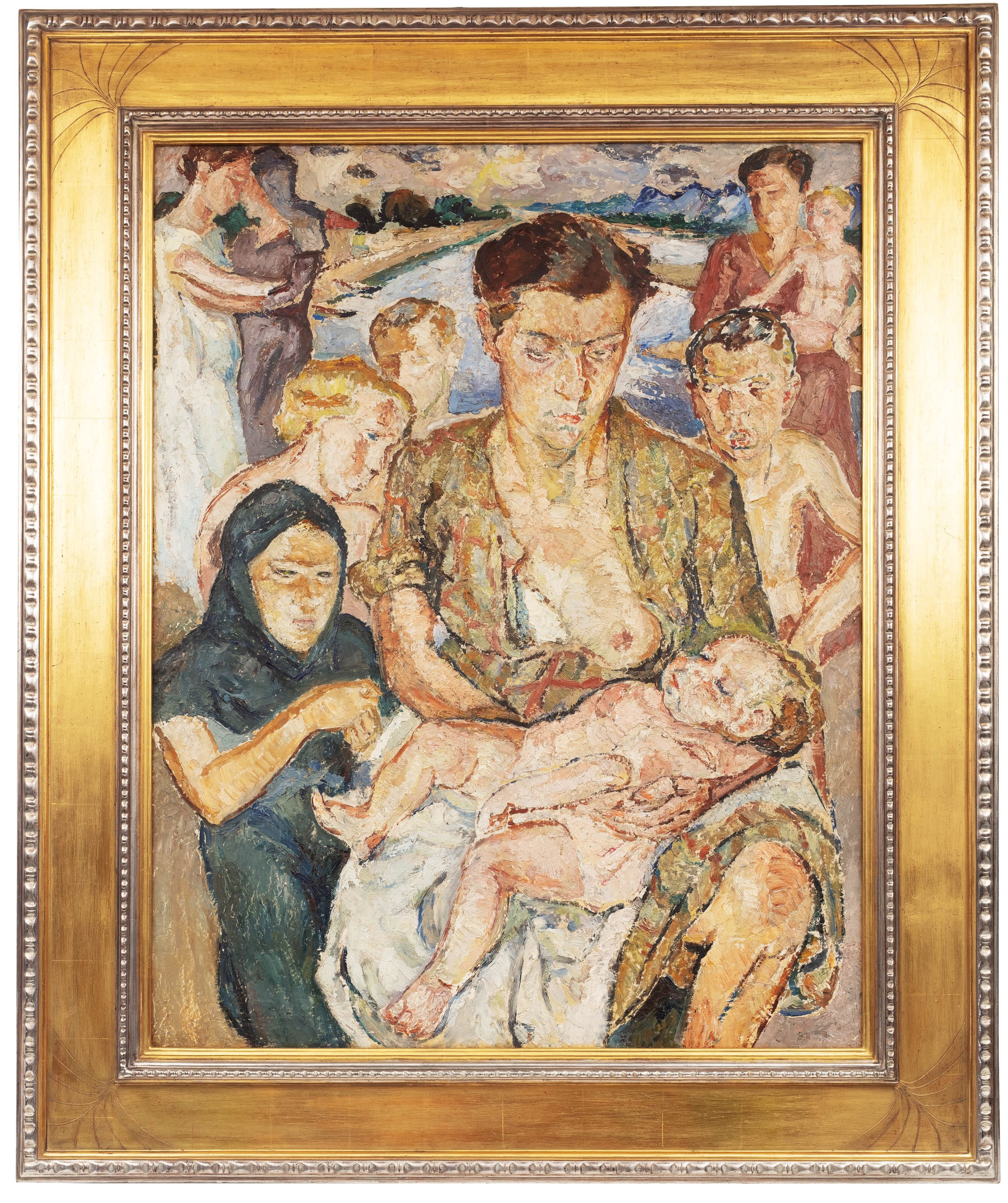Na przestrzeni lat po motyw macierzyństwa Mela Muter w swoich obrazach sięgała wielokrotnie. Każda z tych kompozycji odznaczała się swoistą atmosferą intymności. Prezentowany obraz „Macierzyństwo” to wyróżniająca się kompozycja wśród znanych dotychczas przedstawień tego tematu w obrazach Melani. Zazwyczaj swoich modeli artystka ukazywała w pomieszczeniach, na neutralnych tłach, lub z elementami mebli, otwartych okien, czy też martwych natur. Tutaj scena została przeniesiona na otwartą przestrzeń; w tle widać pejzaż z zakolem rzeki, spowity w promieniach słońca. Centralnie ukazaną postać matki, trzymającą śpiące dziecko, otacza grupa postaci – dzieci i kobiet. Tak jak i w innych pracach Melanii, nie mamy tutaj kontaktu wzrokowego modeli z widzem – postaci są pogrążone w swoich myślach, jakby nieobecne.