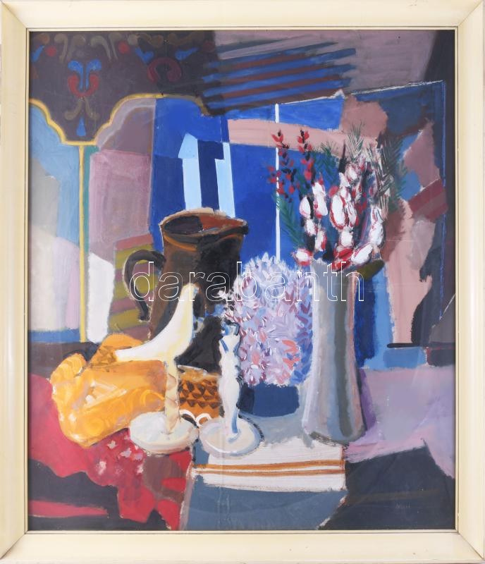 Misch Ádám (1935-1995): Csendélet. Olaj, farost, jelezve jobbra lent (Misch), hátoldalán Képcsarnok Vállalat címkéjével és Misch Ádám autográf feliratával. 1975 körül. Üvegezett fakeretben. 80×70 cm. / oil on fibre board, signed, framed